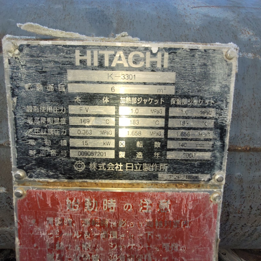 • 사양전열면적: 6 ㎡, 최고사용압력: F.V. , 최고사용온도: 169 ℃, 수압시험압력: 0.363 MPaG, 전동기: 15 kW