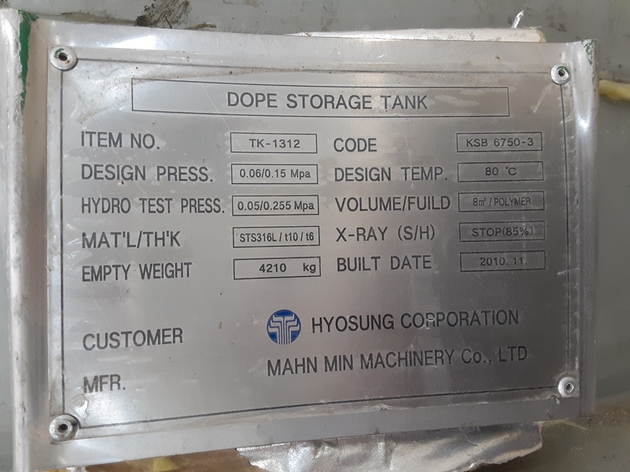 • 사양탱크: 2100(Φ) * 2500(H), 내부: 10T, 쟈켓: 6T, 모터: 15(HP)